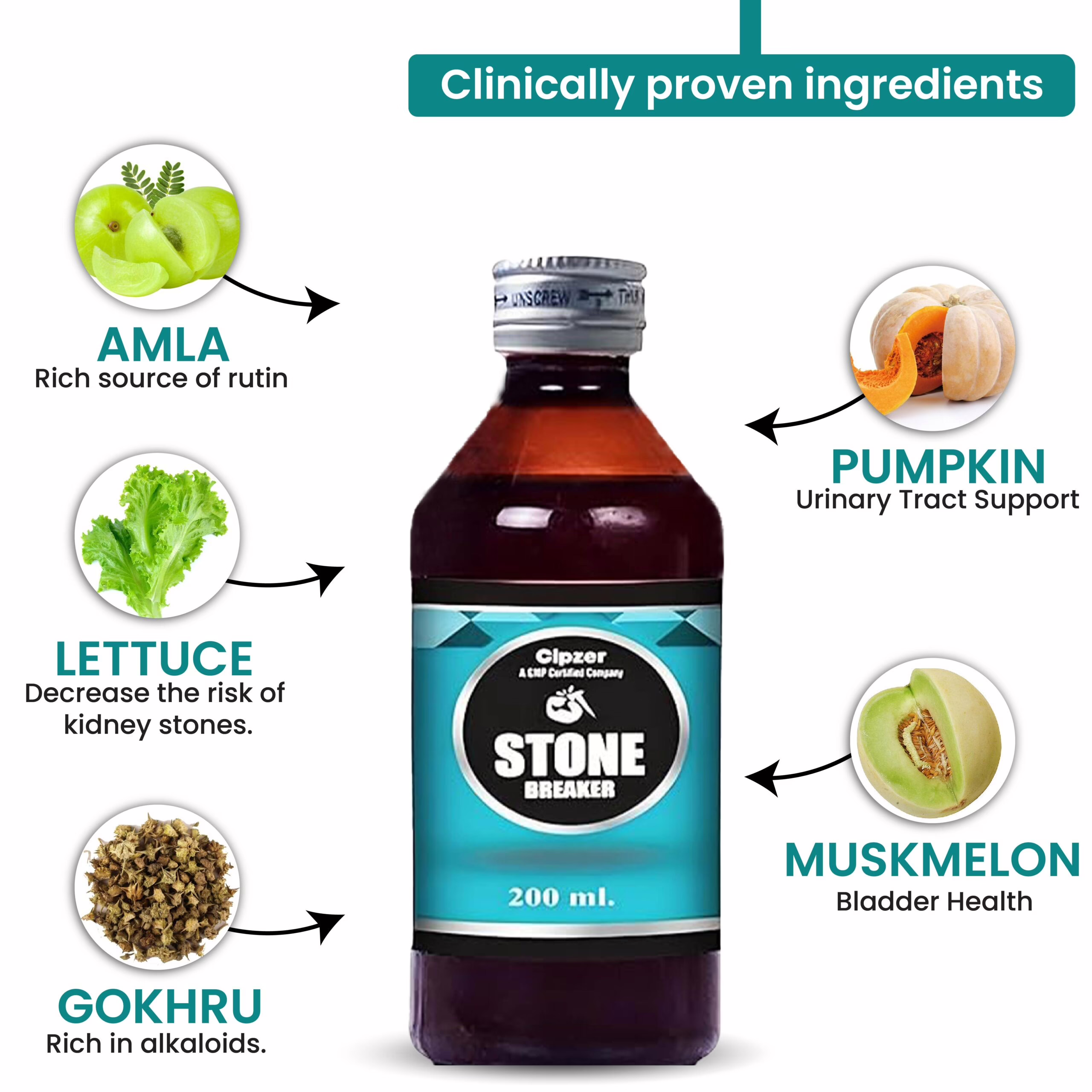 Cipzer Stone Breaker Syrup is a blend of natural elements which caters to kidney stones. It breaks down the stone and naturally removes it through urination. This blend is also used to clean the urinary bladder and kidney by eliminating toxins in your body. It is made of natural ingredients and is free of harmful chemicals..