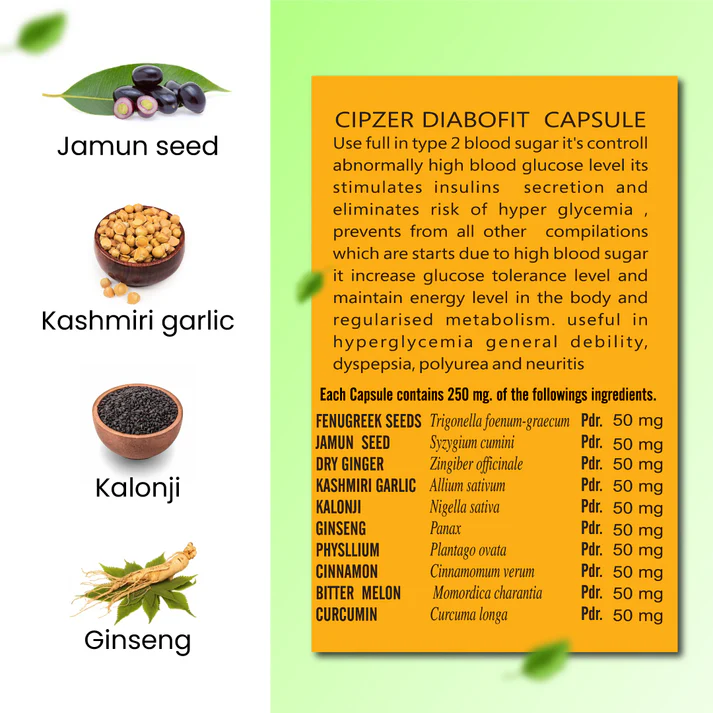 Cipzer Diabofit Capsule controls abnormally high blood glucose levels, stimulates insulin secretion, eliminates the risk of hyperglycemia and prevents all other compilations caused by high blood sugar. It increases glucose tolerance level, maintains energy level in the body and regularises metabolism. The capsule is useful in hyperglycemia, general debility, dyspepsia, polyurea and neuritis.