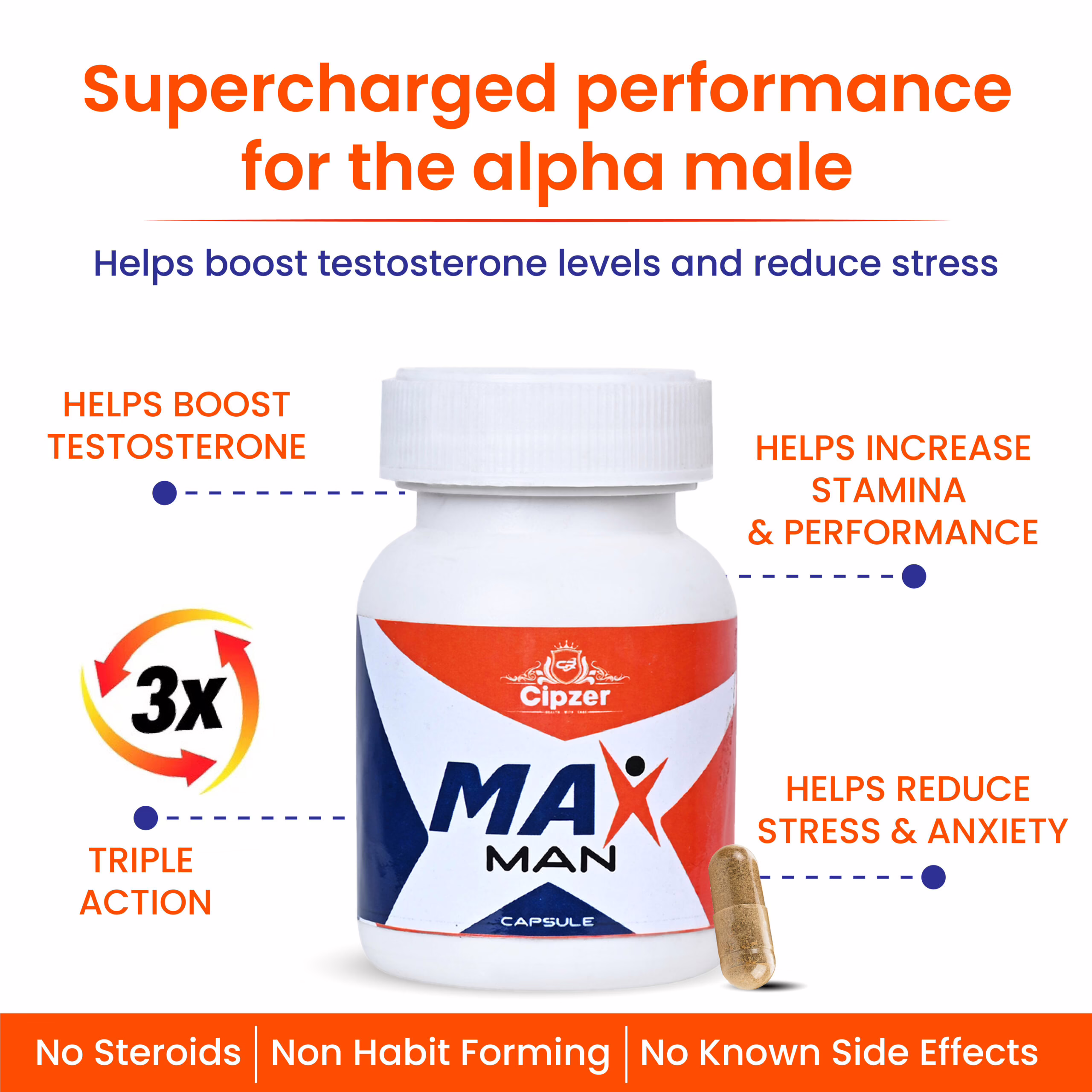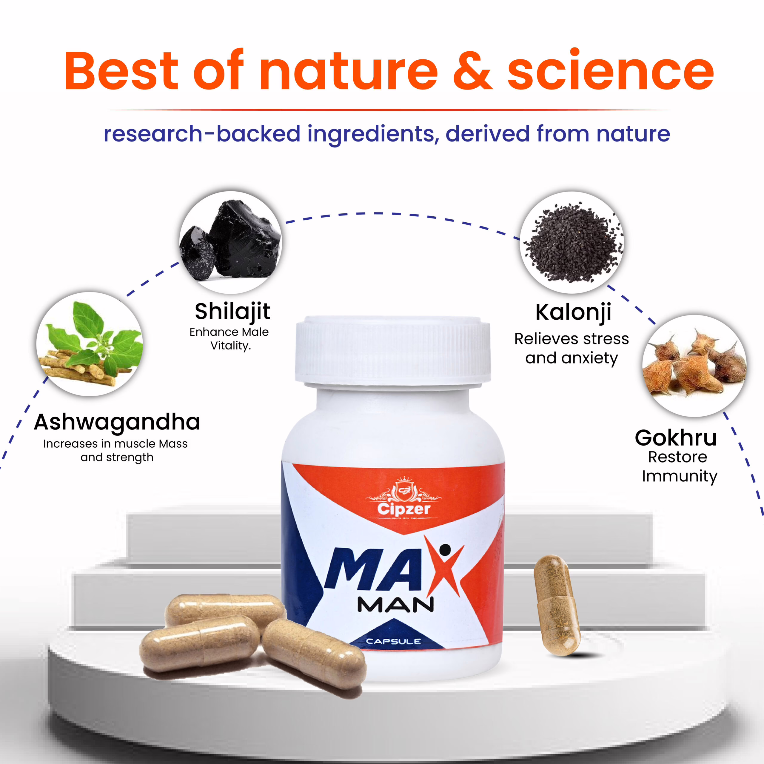 Cipzer Max Man Capsule is a herbal medicine clinically proven to increase erection stamina and endurance in men. It helps with weakness getting tired too early, facing erectile dysfunction and low stamina and power.